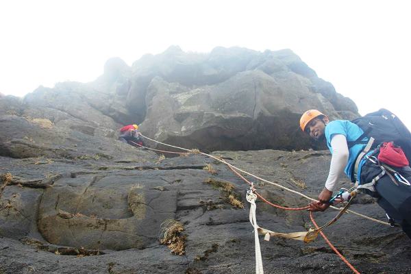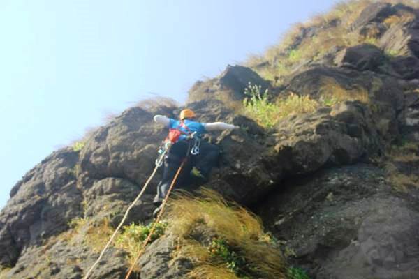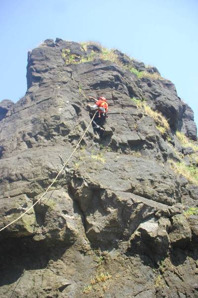 सुमुखचा टॉप होइतो मग पुढे विश्वेश खाली आला. एकेक करून आलेल्या सर्वांना climbingची किमान झलक मिळावी म्हणून आधाराला एक rope पकडत शिवाय belay च्या सहाय्याने pulling टाळून कार्तिकच्या टॉप पर्यंत सर्वांना नेण्यात आले! 270 degrees मध्ये exposed असतानाही पहिल्यांदाच येऊनही सगळ्यांनी हे आव्हान पेलले! मीपण मध्यावरून jumaring चा मागील (could have been) अपघाती incident पाठी टाकण्याच्या अट्टहासाने jumar pair चा वापर केला आणि वरती अमोलला भेटले. समोर सुमुखचं U टाकून rappelling सुरु असताना दिसत होतं. Last मी असल्यामुळे selfi काढून चटाचट मला rappel मारायला लावत अमोलनेपण या बाजूच्या wind up ची तयारी सुरु केली. अगदी दहा ते पंधरा मिनटात सगळे baseपाशी पोचलेले होतो आणि थोड्याच वेळात coil मारून परतीच्या ट्रेकला लागलो.