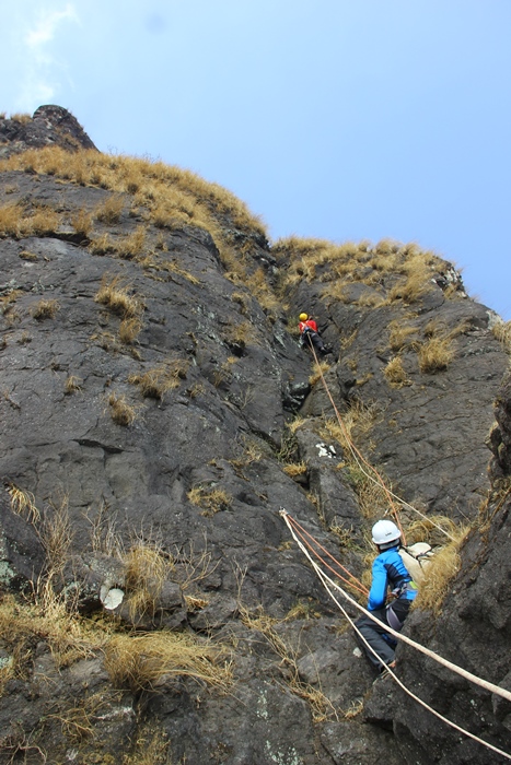 आता अनुभवी व्यक्ती सोबत आहे म्हटल्यावर नवा हुरूप मिळाल्यासारखं सुम्याला वाटलं बहुतेक, पण आलटून-पालटून या दोघांनी अवघ्या एक तासात १ वाजेस्तोवर पुढचा पॅच पूर्ण केला. आम्हाला आमच्या बाजूने काही दिसेना, पण पलीकडून विश्वेशशी होणारं कॉलिंग ऐकून सगळं समजत होतं. राजसला मागून इथले सुंदर लॉँग शॉट्स मिळाले असतील, नक्कीच! आश्चर्यकारक गोष्ट याच क्षणी घडली, की अभ्या ऐवजी राज ने मला ३र्ड मॅन म्हणून यायला सांगितलं! त्याने आधीच रोप क्युड्यान्मधून वेगळा करून योग्य फॉल लाइन वर आणून ठेवला होता, त्यामुळे सरळसोट जुमारिंग करायचं होतं, नशीबाने यावेळी धीरही झाला, आणि अभ्याच्या, विश्वेश यांच्या मार्गदर्शनाने मी हळू हळू करत वरती गेले. उजवीकडचा एका मुळीपासून्चा क्लाइंबिंग पॅच सुद्धा जुमार् कमी वापरत करायला मिळाला! वरती जाऊन बघते तर काय! जवळपास १०० स्क्वेरफुट जागा फिरायला! वरती मागच्या बाजूस पायर्यांचा एक छोटासा रस्ताही आहे. थोडाफार दगडी सुळक्याचा शेवटचा भागसुद्धा आहे. इथे जरासा वेळ आम्ही विश्रांती घेत अभ्या आणि पल्लवीच्या एकत्रित जुमारिंग पूर्णतेची वाट पाहत पडलो. "१ तास झोपलोत आपण!" असं म्हणत सुमुखने उठवलं, आणि आता मात्र सूत्रे हाती घ्यायला राज सर खाली गेले. मला थोडीफार रोप फिक्सिंग ची कामं सांगत त्याने पल्लवीला वरती आणले आणि सर्वांचे सेल्फी, टाइमर फोटो झाल्यावर एकेक करून आम्ही रॅप्पेल करत खाली उतरलो. यू टाकून अभ्या शेवटचा वरून खाली आला.