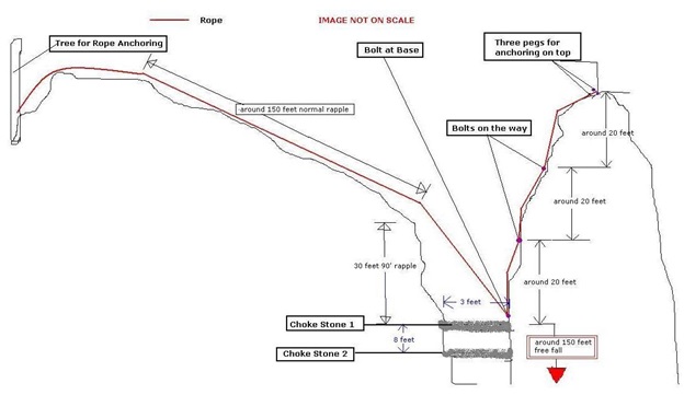 At first one of our members rappelled down and stationed himself at the choke stone point to guide others. Others started rappelling approx. 180ft down to choke stone point. Rappelling till 150 feet is of beginners' level, but there is a 30ft rappel of difficult level towards the choke stone. (Please refer the below figure : took off the net). The climbing task initiated from this point. There are base bolts available at the start of the climbing. Initial moves to reach these bolts are difficult. There is a patch on the right side (when you are facing towards pinnacle) from where one can start. After this point, two more bolts are available at approx. 20 feet. There is a ledge in between where you can take rest. There is a kind of overhang toward the final climb move.
